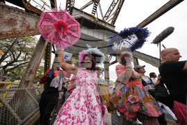Members of the Original New Orleans Baby Dolls march in a second line parade during an event to commemorate the 20th anniversary of Hurricane Katrina, in the Lower Ninth Ward of New Orleans, Friday, Aug. 29, 2025. (AP Photo/Alex Brandon)