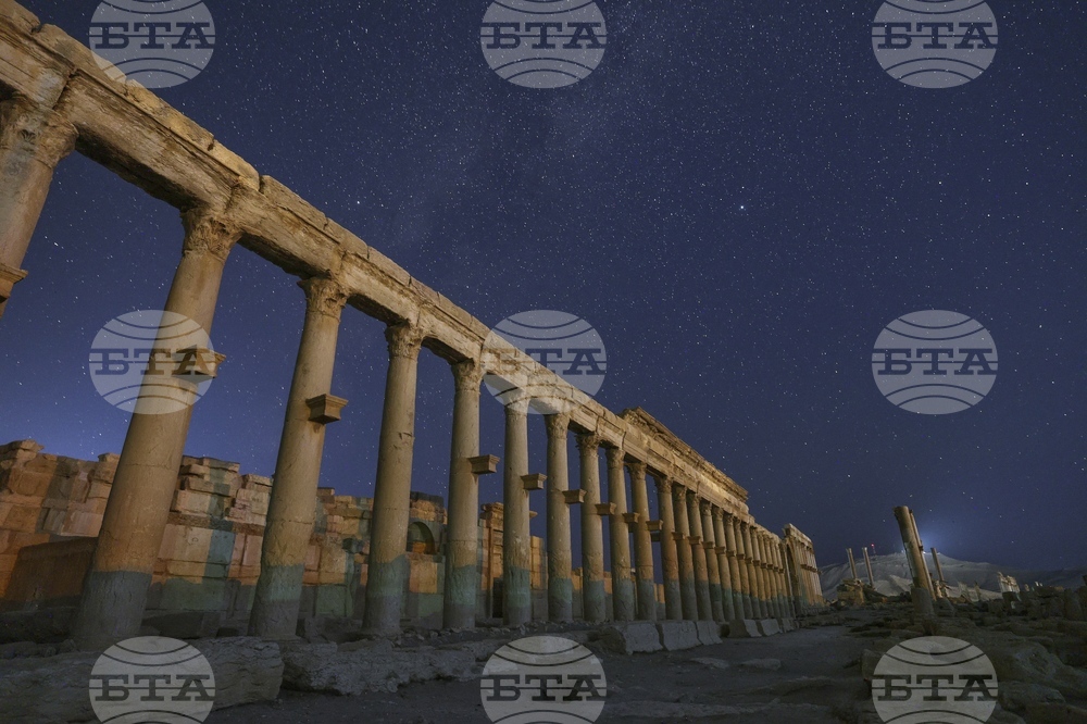 The colonnaded Long Street in the ruins of the ancient city of Palmyra is seen under a star-filled sky in Syria, early Wednesday, Aug. 27, 2025. (AP Photo/Ghaith Alsayed)