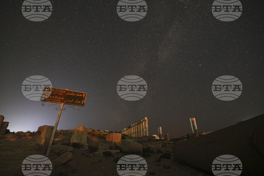 The ruins of the ancient city of Palmyra under a star-studded sky in Syria, in the late hours of Tuesday, Aug. 26, 2025.(AP Photo/Ghaith Alsayed)