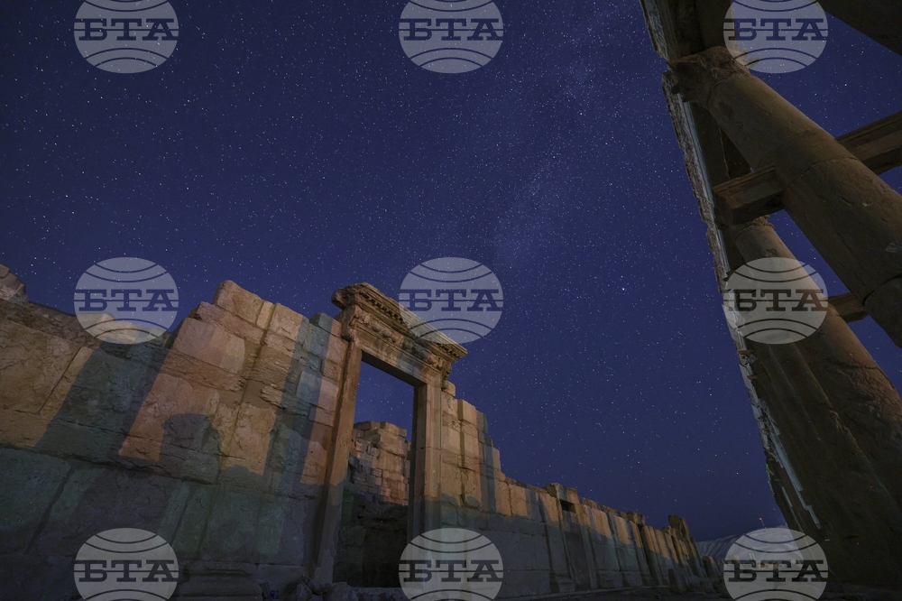The façade of the Temple of Bel's precinct, in the ruins of the ancient city of Palmyra, is seen under a star-studded sky in Syria, early Wednesday, Aug. 27, 2025. (AP Photo/Ghaith Alsayed)