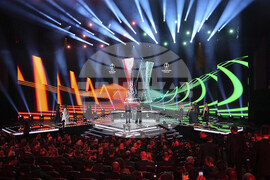 The stage is illuminated during the Europa League and Conference League soccer league phase draw in Monaco, Friday, Aug. 29, 2025. (AP Photo/Laurent Cipriani)