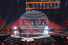 TV cameras film the Europa League and Conference League soccer league phase draw in Monaco, Friday, Aug. 29, 2025. (AP Photo/Laurent Cipriani)