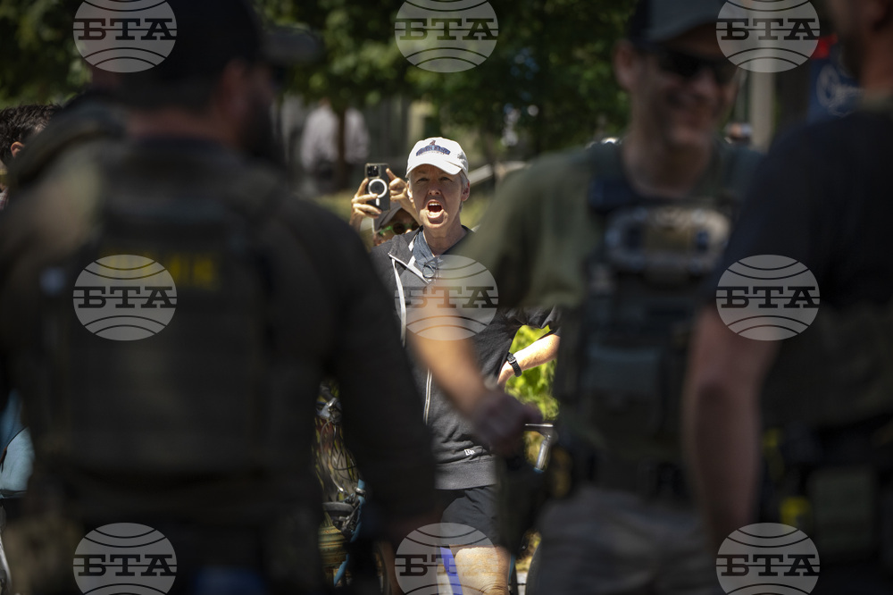 A person yells at federal officers as they stand at a checkpoint operated by the Metropolitan Police Department and federal agencies, including officers from Immigration and Customs Enforcement (ICE) and Homeland Security Investigations (HSI), on Georgia Avenue in the northern part of Washington, Saturday, Aug. 30, 2025. (AP Photo/Mark Schiefelbein)
