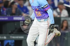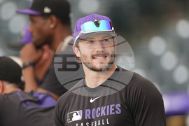 Colorado Rockies left fielder Mickey Moniak warms up before a baseball game against the Chicago Cubs, Saturday, Aug. 30, 2025, in Denver. (AP Photo/David Zalubowski)