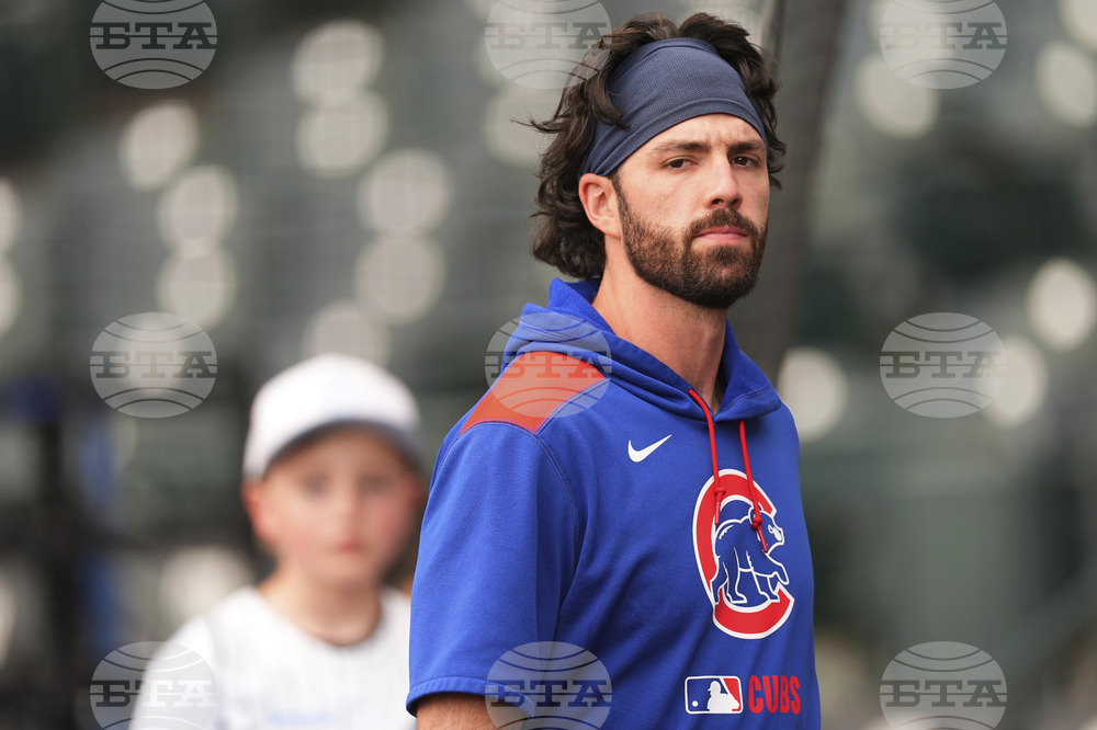 Chicago Cubs shortstop Dansby Swanson looks on before a baseball game against the Colorado Rockies, Saturday, Aug. 30, 2025, in Denver. (AP Photo/David Zalubowski)