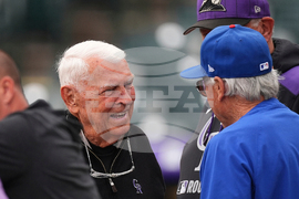 Clinton Hurdle, left, father of Colorado Rockies interim bench coach Clint Hurdle, back right, greets Chicago Cubs coach Jerry Weinstein, front right, as players warm up before a baseball game Saturday, Aug. 30, 2025, in Denver. (AP Photo/David Zalubowski)