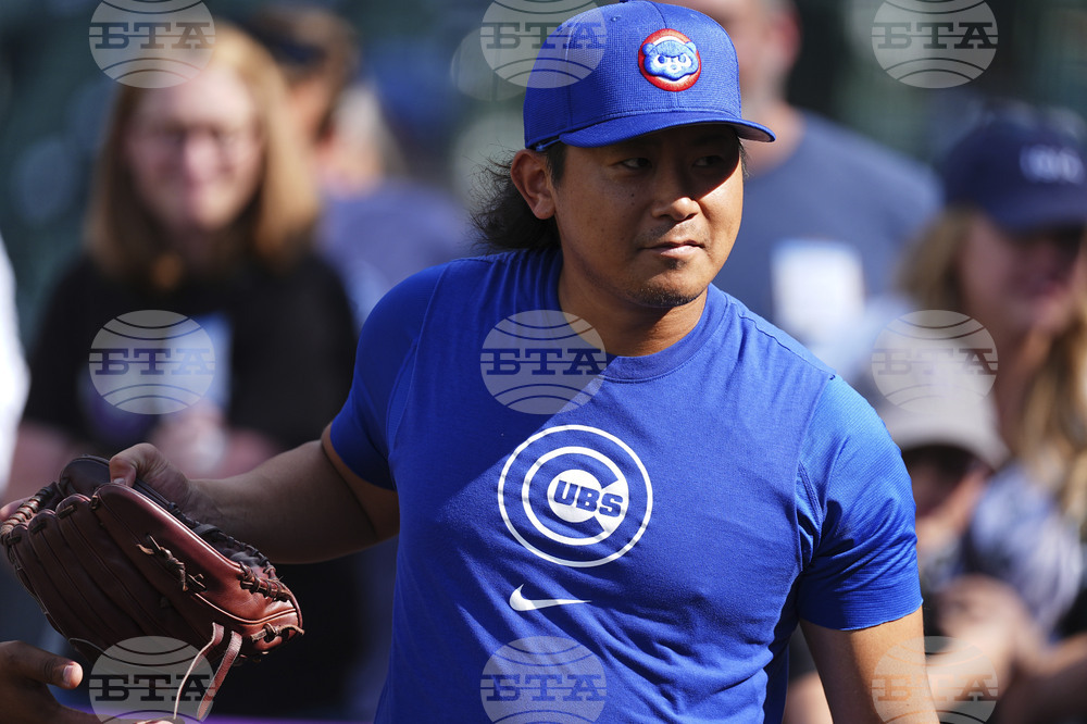 Chicago Cubs pitcher Shota Imanaga warms up before a baseball game against the Colorado Rockies, Saturday, Aug. 30, 2025, in Denver. (AP Photo/David Zalubowski)
