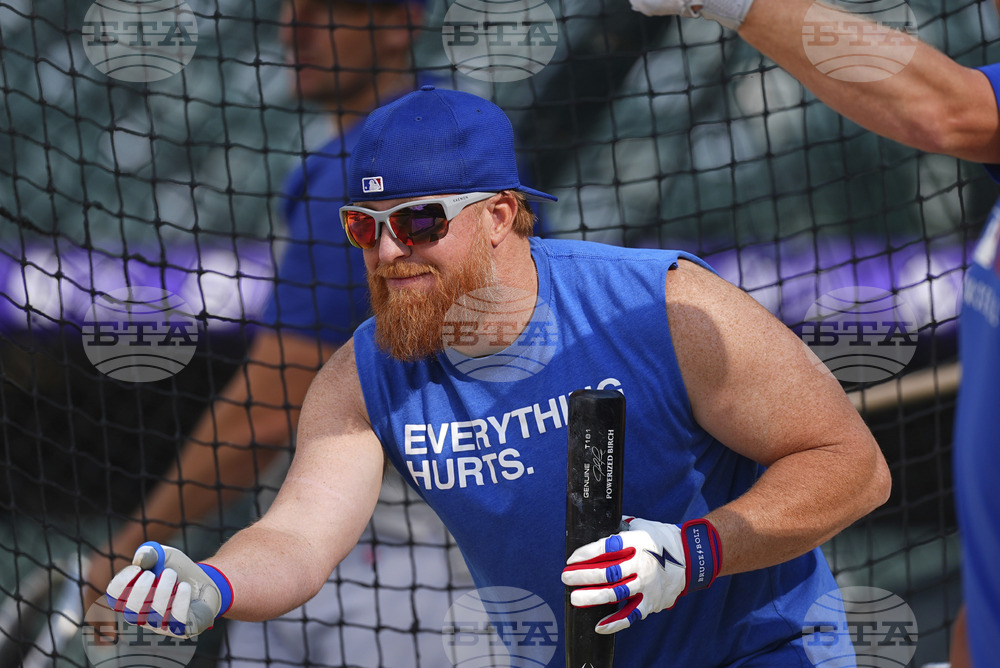 Chicago Cubs first baseman Justin Turner warms up before a baseball game against the Colorado Rockies, Saturday, Aug. 30, 2025, in Denver. (AP Photo/David Zalubowski)