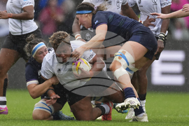 Scotland's Emma Wassell and Fiji's Bitila Tawake battle for the ball during the pool B match between Scotland and Fiji, at the 2025 Women's Rugby World Cup, in Manchester, England, Saturday, Aug. 30, 2025. (Mike Egerton/PA via AP)