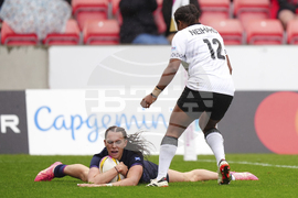 Rhona Lloyd of Scotland, right on the ground scores her sides second try during the pool B match at the 2025 Women's Rugby World Cup between Scotland and Fiji, in Manchester, England, Saturday, Aug. 30, 2025. (AP Photo/Dave Shopland)