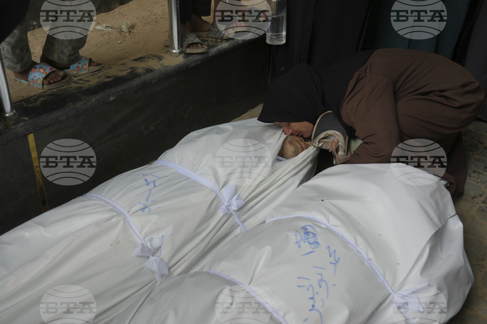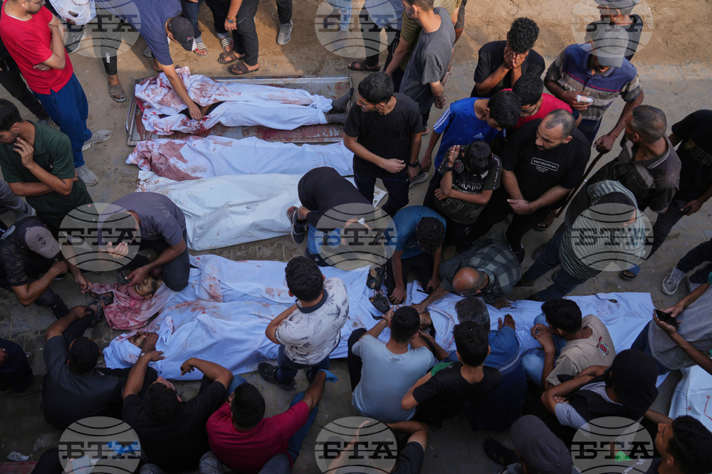 Palestinians mourn over the bodies of people who were killed in an Israeli military strike, during their funeral outside Shifa Hospital in Gaza City, Sunday, Aug. 31, 2025. (AP Photo/Jehad Alshrafi)