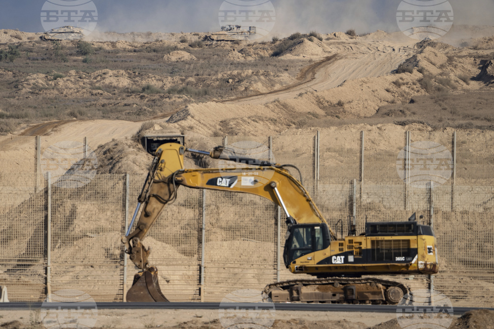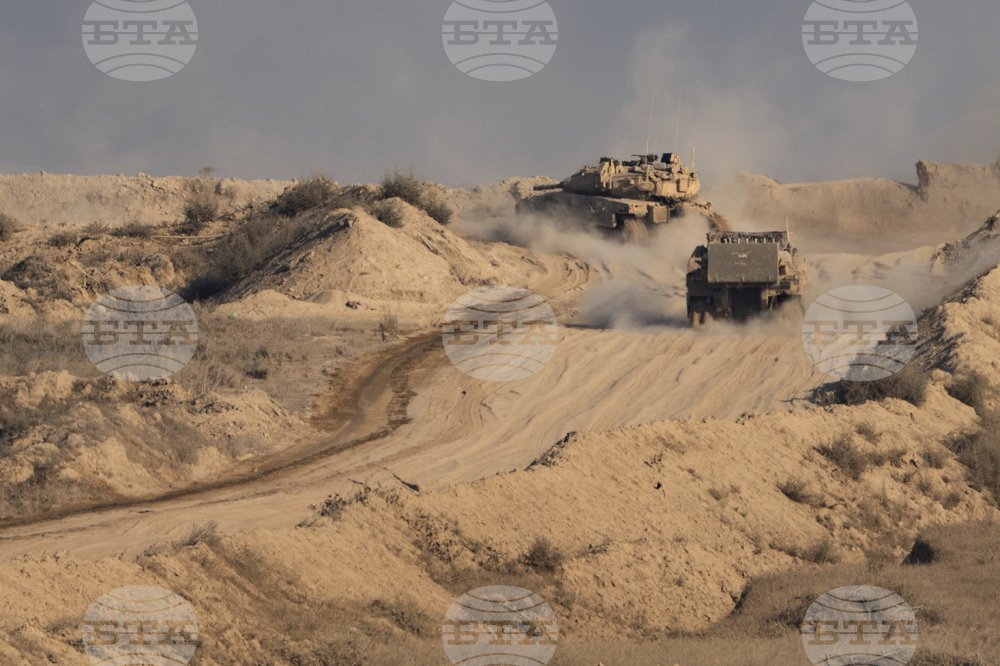 An Israeli armored vehicle moves in an area in the Gaza Strip, as seen from southern Israel, Sunday, Aug. 31, 2025. (AP Photo/Maya Levin)
