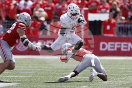 Texas running back Quintrevion Wisner, top, leaps over Ohio State defensive back Jermaine Mathews during the second half of an NCAA college football game, Saturday, Aug. 30, 2025, in Columbus, Ohio. (AP Photo/Jay LaPrete)