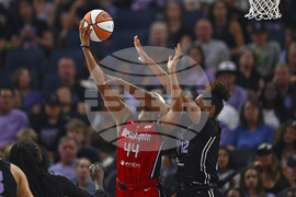 Golden State Valkyrie's Iliana Rupert (12) fouls Washington Mystics' Kiki Iriafen (44) in the first quarter of a WNBA basketball game at Chase Center in San Francisco, Saturday, Aug. 30, 2025. (Jose Carlos Fajardo/Bay Area News Group via AP)