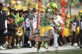 Oregon running back Dierre Hill Jr. (23) pushes off Montana State quarterback River Warren (6) during the first half of an NCAA college football game, Saturday, Aug. 30, 2025, in Eugene, Ore. (AP Photo/Lydia Ely)