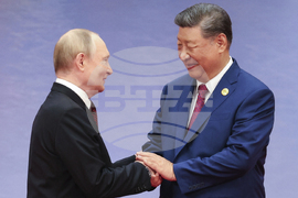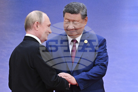 Russian President Vladimir Putin, left, and Chinese President Xi Jinping shake hands at a ceremony to welcome Heads of States of the Shanghai Cooperation Organization (SCO) summit in Tianjin, China, Sunday, Aug. 31, 2025. (Alexander Kazakov, Sputnik, Kremlin Pool Photo via AP)