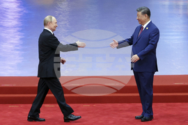Russian President Vladimir Putin, left, and Chinese President Xi Jinping greet each other at a ceremony to welcome Heads of States of the Shanghai Cooperation Organization (SCO) summit in Tianjin, China, Sunday, Aug. 31, 2025. (Sergei Bobylev, Sputnik, Kremlin Pool Photo via AP)