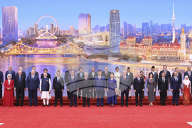Russian President Vladimir Putin, center left, Chinese President Xi Jinping, center, and his wife Peng Liyuan, center right, pose for a photo with other leaders during a ceremony to welcome Heads of States of the Shanghai Cooperation Organization (SCO) summit in Tianjin, China , on Sunday, Aug. 31, 2025. (Sergei Bobylev, Sputnik, Kremlin Pool Photo via AP)