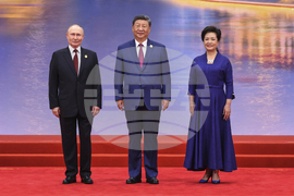 In this photo released by Xinhua News Agency, Chinese President Xi Jinping, center, and his wife Peng Liyuan, right pose with visiting Russian President Vladimir Putin, left, during a ceremony to welcome heads of state at the Shanghai Cooperation Organization (SCO) summit in Tianjin, China , on Sunday, Aug. 31, 2025. (Huang Jingwen/Xinhua via AP)