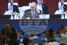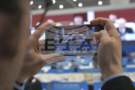 A journalist films a screen at the media center broadcasting live of Russian President Vladimir Putin's delivering the speech during the Shanghai Cooperation Organization in Tianjin, China, Monday, Sept. 1, 2025. (AP Photo/ Rafiq Maqbool)