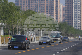 The motorcade of visiting leaders arrives at the venue of the Shanghai Cooperation Organization (SCO) summit in Tianjin, China, Monday, Sept. 1, 2025. (AP Photo/Rafiq Maqbool)