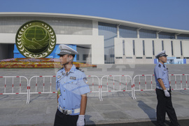 Police officers stand guard outside the venue of the Shanghai Cooperation Organization (SCO) summit in Tianjin, China, Monday, Sept. 1, 2025. (AP Photo/ Rafiq Maqbool)