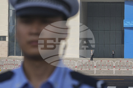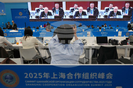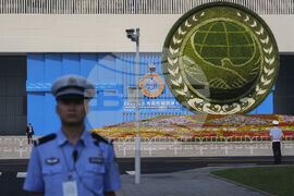A police officer stands guard outside the venue of the Shanghai Cooperation Organization (SCO) summit in Tianjin, China, Monday, Sept. 1, 2025. (AP Photo/ Rafiq Maqbool)