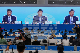 Journalists film a screen at the media center broadcasting live of Chinese President Xi Jinping, chairing the summit with leaders of member countries of the Shanghai Cooperation Organization in Tianjin, China , Monday, Sept. 1, 2025. (AP Photo/ Rafiq Maqbool)
