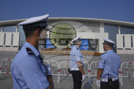 Police officers stand outside the venue of the Shanghai Cooperation Organization (SCO) summit in Tianjin, China, Monday, Sept. 1, 2025. (AP Photo/ Rafiq Maqbool)