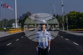 A police officer stands guard outside the venue of the Shanghai Cooperation Organization (SCO) summit in Tianjin, China , Monday, Sept. 1, 2025. (AP Photo/ Rafiq Maqbool)