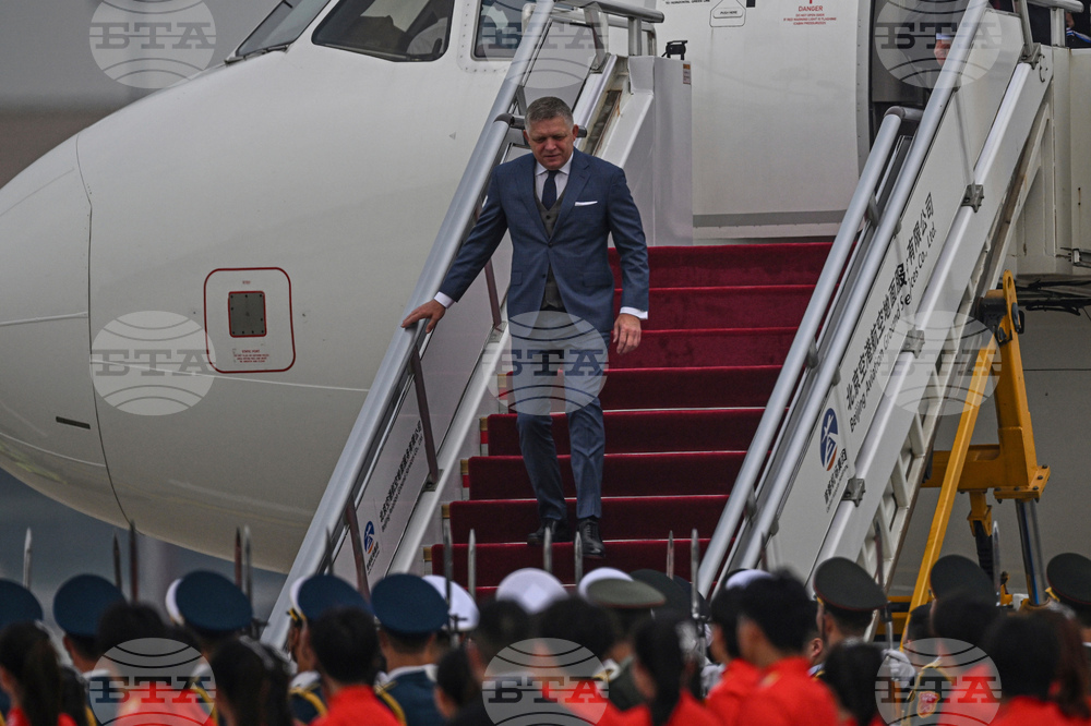 Slovakia's Prime Minister Robert Fico, center, arrives at the Beijing Capital International Airport, ahead of the military parade marking the 80th anniversary of victory over Japan and the end of World War II, in Beijing Tuesday, Sept. 2, 2025. (Jade Gao/Pool Photo via AP)