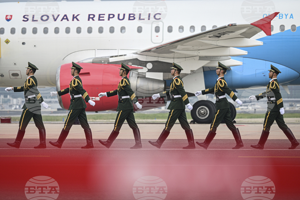 A plane carrying Slovakia's Prime Minister Robert Fico lands at the Beijing Capital International Airport, ahead of the military parade marking the 80th anniversary of victory over Japan and the end of World War II, in Beijing Tuesday, Sept. 2, 2025. (Jade Gao/Pool Photo via AP)