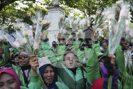 Ride hailing drivers distribute flowers during a peace rally following days of violent protests against lavish allowances given to parliament members, in Jakarta, Indonesia, Tuesday, Sept. 2, 2025. (AP Photo/Dita Alangkara)