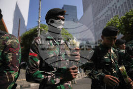 Indonesian soldiers hold flowers during a peace rally following days of violent protests against lavish allowances given to parliament members, in Jakarta, Indonesia, Tuesday, Sept. 2, 2025. (AP Photo/Dita Alangkara)