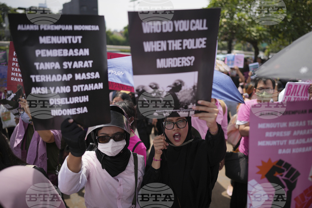 An activist holds a poster during a rally denouncing violence allegedly committed by the police during days of protests against lavish allowances given to the members of the parliament, in Jakarta, Indonesia, Wednesday, Sept. 3, 2025. (AP Photo/Dita Alangkara)