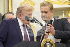 FOX News reporter Peter Doocy shows President Donald Trump a photo on his phone during an event about the relocation of U.S. Space Command headquarters from Colorado to Alabama in the Oval Office of the White House, Tuesday, Sept. 2, 2025, in Washington. (AP Photo/Mark Schiefelbein)