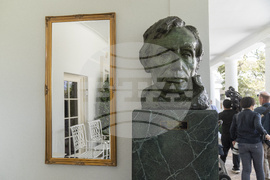 A bust of Abraham Lincoln by artist Gutzon Borglum is placed outside the Oval Office at the White House, Tuesday, Sept. 2, 2025, in Washington. (AP Photo/Mark Schiefelbein)