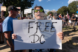Becky Mascal, holds a banner as demonstrators protest against President Donald Trump's use of federal law enforcement and National Guard troops in the city at the White House Tuesday, Sept. 2, 2025, in Washington. (AP Photo/Manuel Balce Ceneta)