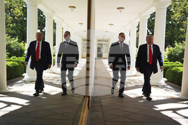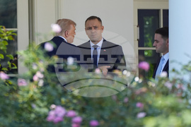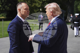President Donald Trump walks out to greet Polish President Karol Nawrocki at the White House, Wednesday, Sept. 3, 2025, in Washington. (AP Photo/Evan Vucci)