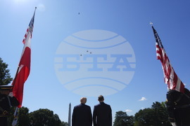 President Donald Trump and Polish President Karol Nawrocki watch a military aircraft flyover at the White House, Wednesday, Sept. 3, 2025, in Washington. The Washington Monument stands in the distance. (AP Photo/Evan Vucci)