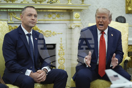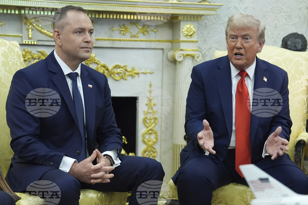 President Donald Trump shakes hands with Polish President Karol Nawrocki, during a meeting in the Oval Office of the White House, Wednesday, Sept. 3, 2025, in Washington. (AP Photo/Evan Vucci)
