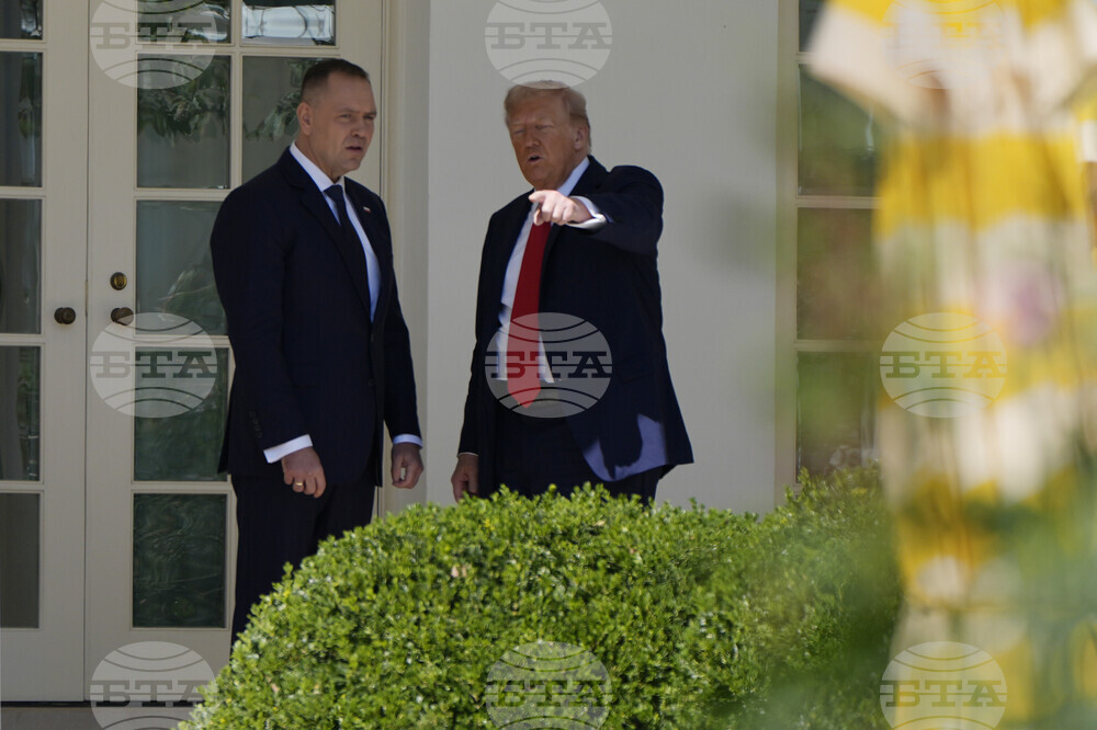 President Donald Trump, right, pointing towards the Rose Garden as he talks with Polish President Karol Nawrocki, left, outside the Oval Office of the White House, Wednesday, Sept. 3, 2025, in Washington. (AP Photo/Alex Brandon)