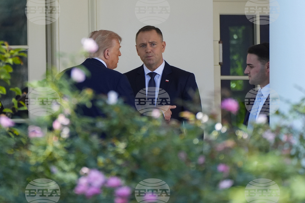 President Donald Trump, left, talks with Polish President Karol Nawrocki, center, outside the Oval Office of the White House, Wednesday, Sept. 3, 2025, in Washington. (AP Photo/Alex Brandon)