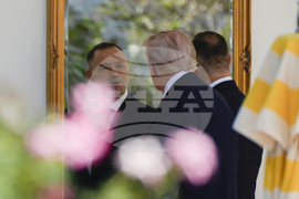Polish President Karol Nawrocki, right, looking at his reflection in a mirror as he walks with President Donald Trump, Wednesday, Sept. 3, 2025, in Washington. (AP Photo/Alex Brandon)