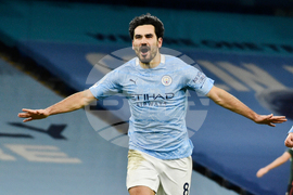 FILE - Manchester City's Ilkay Gundogan celebrates after scoring his side's third goal during the English Premier League soccer match between Manchester City and Tottenham Hotspur at Etihad Stadium in Manchester, England, on Feb. 13, 2021. (AP Photo/Rui Vieira, Pool File)