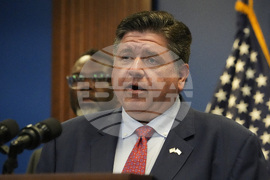 Illinois Gov. JB Pritzker, center, speaks during a press conference Tuesday, Sept. 2, 2025, in Chicago. (AP Photo/Kiichiro Sato)