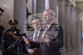 Speaker of the House Mike Johnson, R-La., center left, and House Oversight Committee Chairman James Comer, R-Ky., talk to reporters after a closed-door meeting with victims in the Jeffrey Epstein sex trafficking case investigation, at the Capitol in Washington, Tuesday, Sept. 2, 2025. (AP Photo/J. Scott Applewhite)