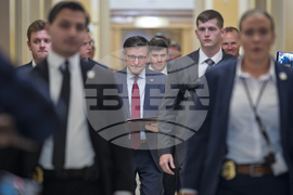 Speaker of the House Mike Johnson, R-La., is surrounded by security and staff as he arrives for a closed-door meeting with victims in the Jeffrey Epstein sex trafficking case investigation, at the Capitol in Washington, Tuesday, Sept. 2, 2025. (AP Photo/J. Scott Applewhite)