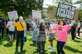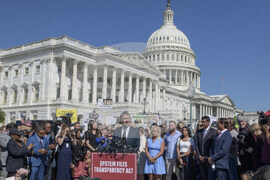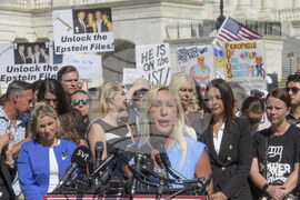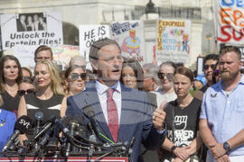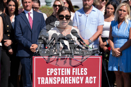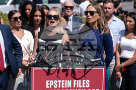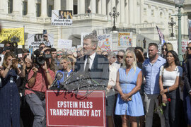Protesters rally at a news conference calling for Congress to release all of the Jeffrey Epstein files, outside the U.S. Capitol, Wednesday, Sept. 3, 2025 in Washington. (AP Photo/Kevin Wolf)