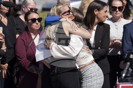 Anouska de Georgiou, left, hugs Marina Lacerda as Courtney Wild, right, speaks during a news conference at the U.S. Capitol, Wednesday, Sept. 3, 2025, in Washington. (AP Photo/Jose Luis Magana)
